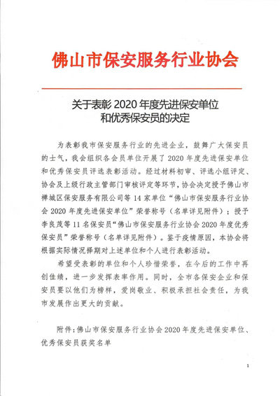 關(guān)于表彰2020年度先進(jìn)保安單位和優(yōu)秀保安員的決定